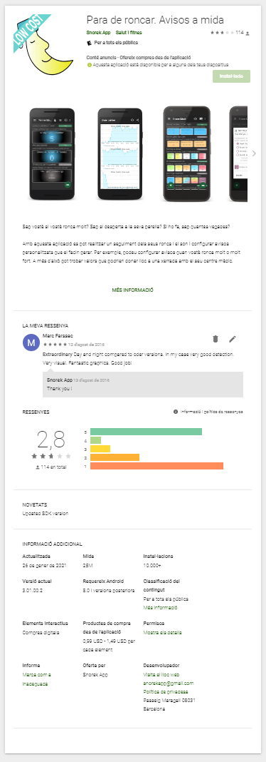 The first Snorek App was published in Berlin (Germany) in August 2013. Initially only one App hit the market and latter the same year, other product variants with a lot of granularity were published. Snorek Free was as it name says, free of charge and allowed the user to know how many times had snored over one night.