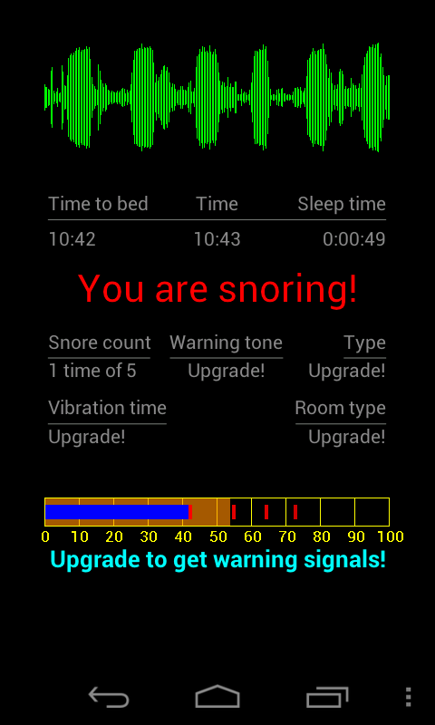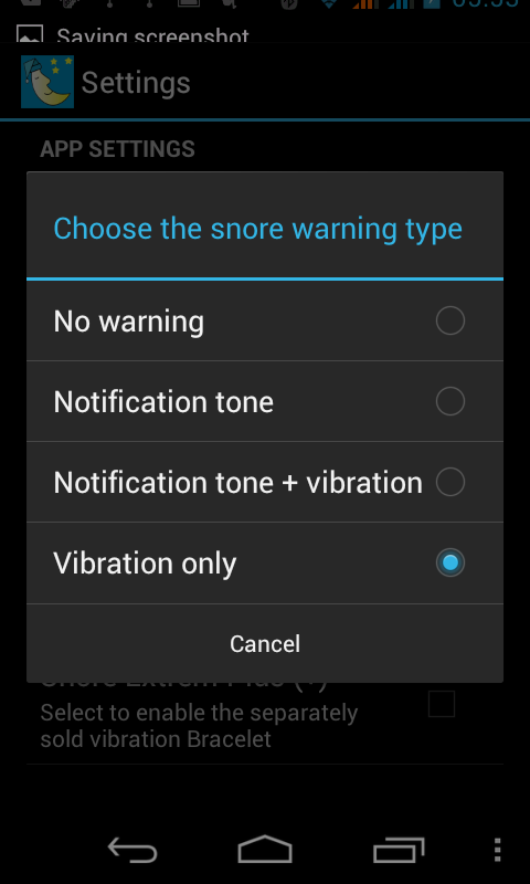 Snorek Extrem was the most configuratble of the Apps. It had settings to fine tune the snore detection, say for example that you were sleeping with an open window. The algorithm would be more strict when filtering noises. It also offer the possibility to auto configure itself from the snores of previous nights remembering your "average" snore noise level and warning you with more confidence.