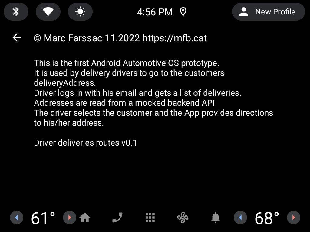 Version 0.1 is the very first prototype runing on Android Automotive. Currently it lets the driver input an email address that will be used to get the list of orders that he has to deliver.