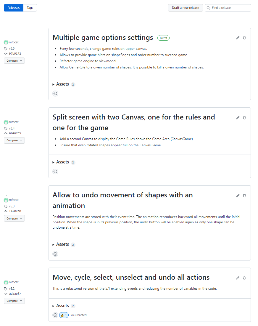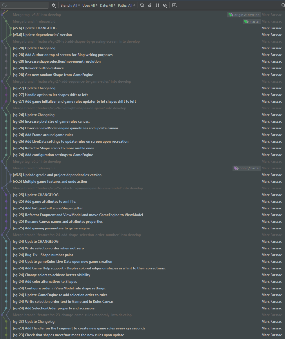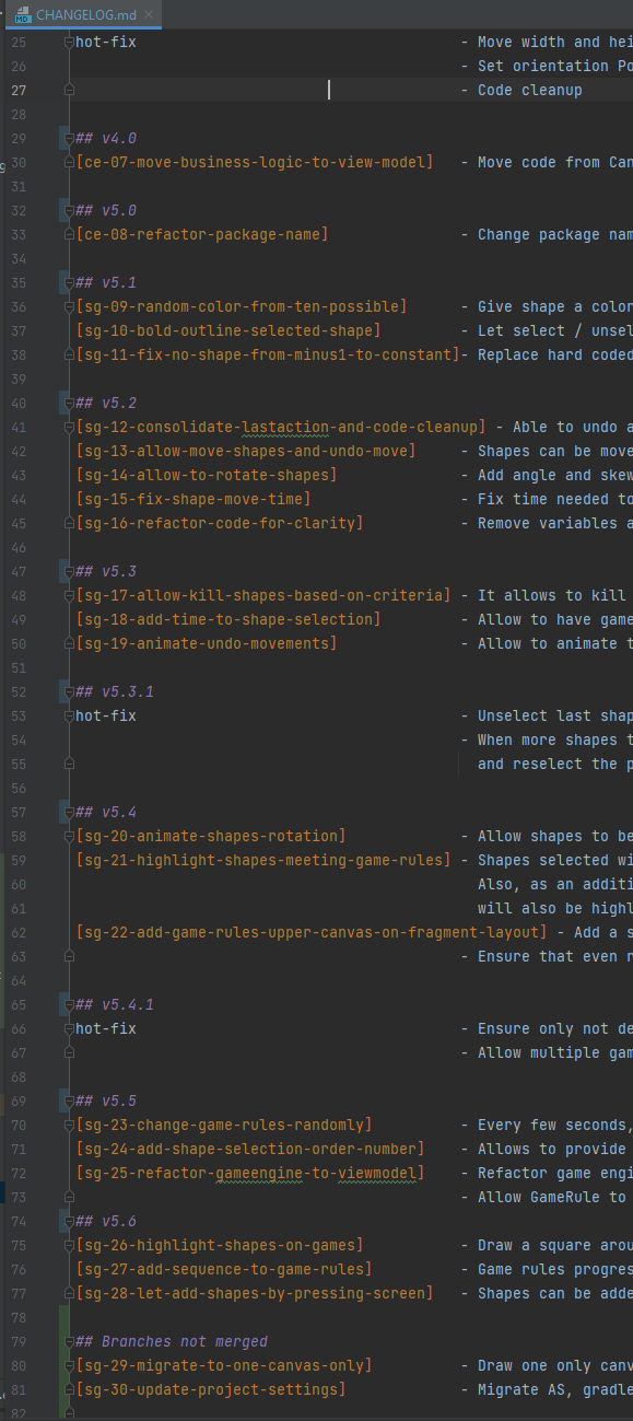 Each feature is documented in Jira and also in a CHANGELOG that belongs to the repository. The image below displays how the changelog has evolved. It summarizes what each brnach does, which branches belong to which release and also when a hot-fix was created and deployed.
