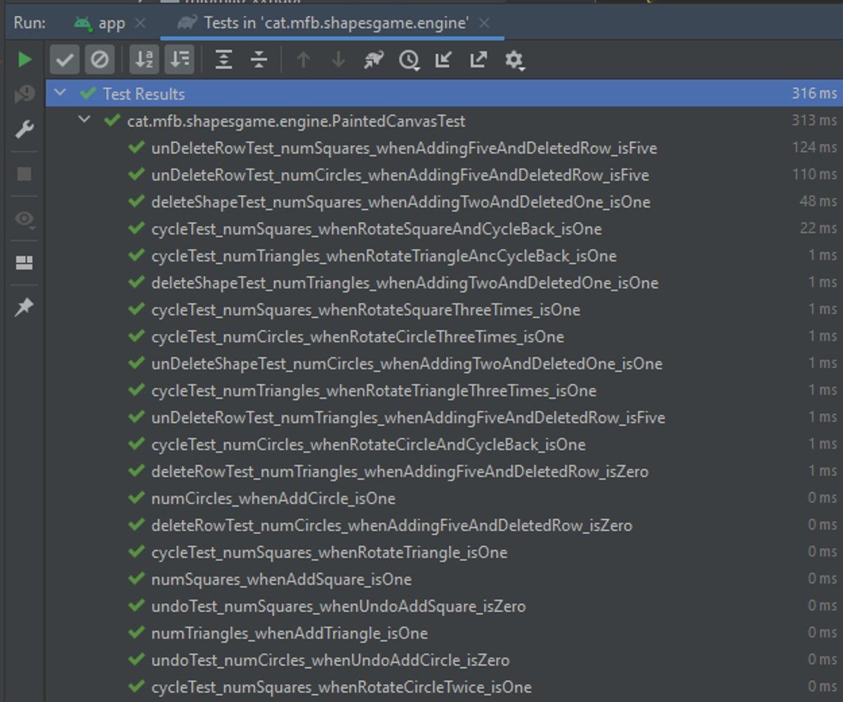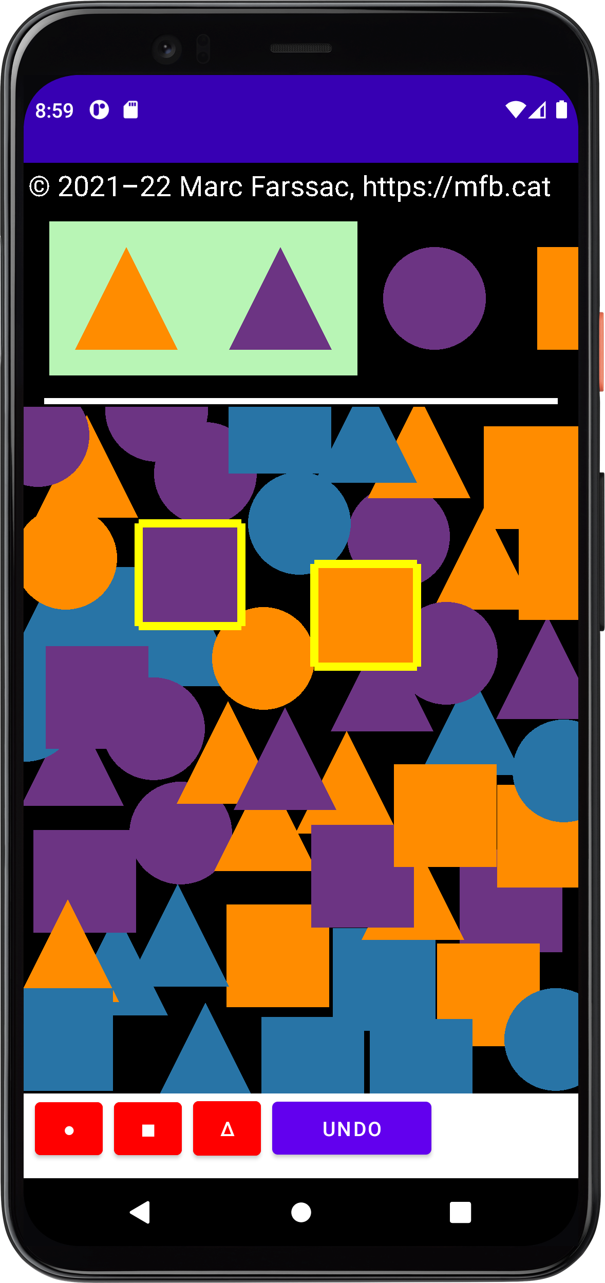 The goal behind this project is to let a gamer cycle shapes to achieve a certain sequence of shapes and colors and "kill" them. On the upper side of the screen the player sees a sequence of shapes. One, two or three of them are surrounded by a green layer to inform the player of the seek sequence. Pushing on the screen, the player adds shapes of random type and color. The Goal is to "long press" a shape as in the given sequence to kill it and get points.