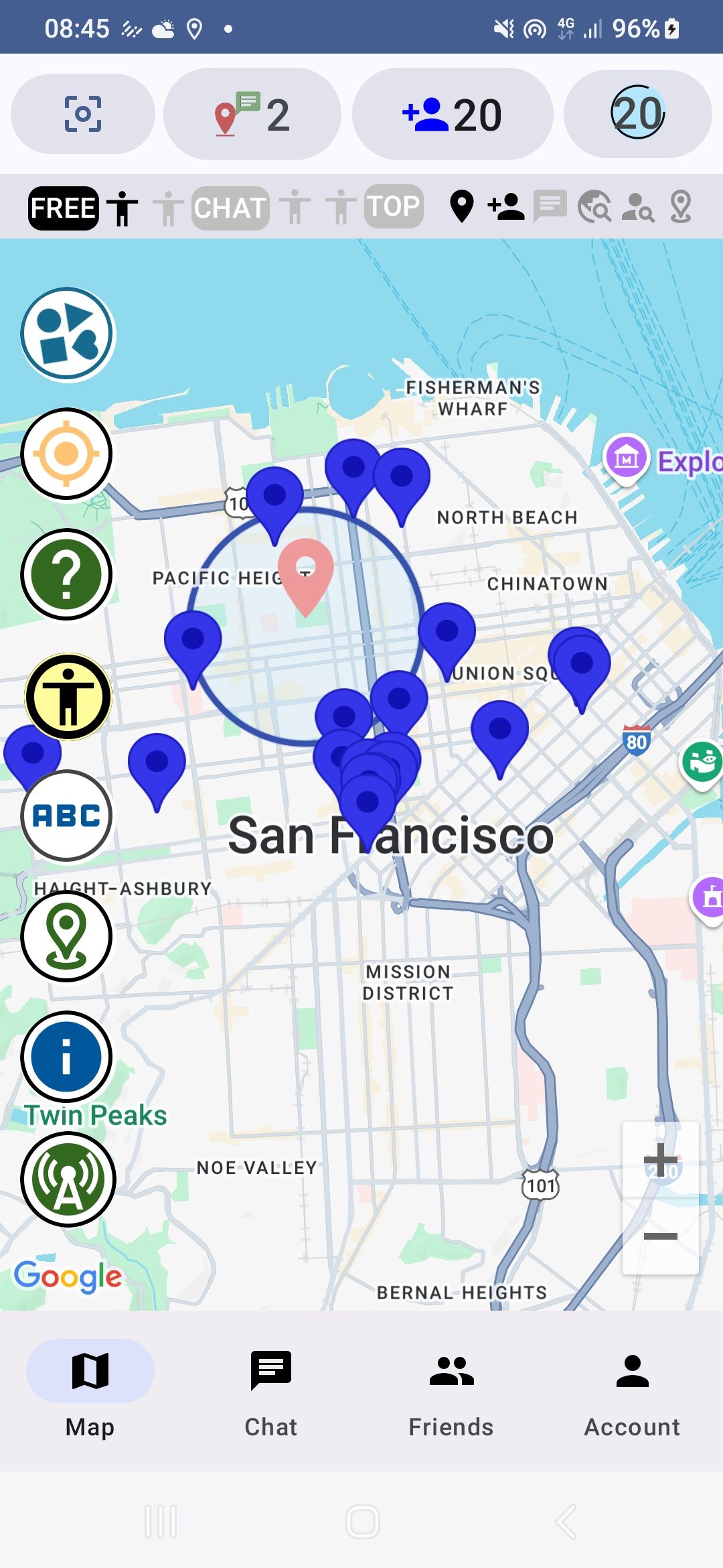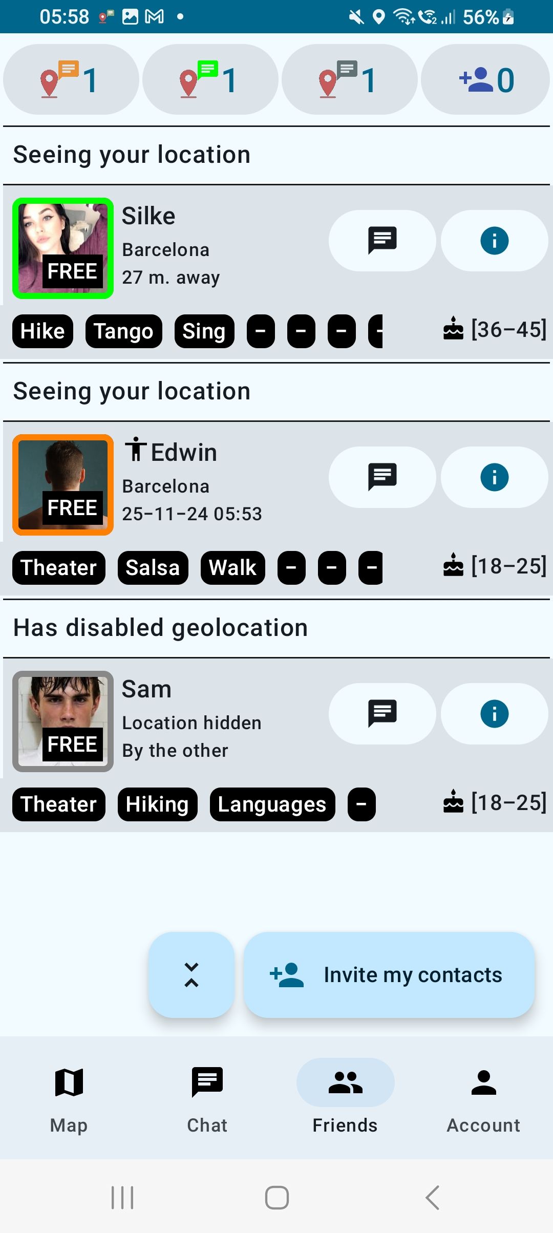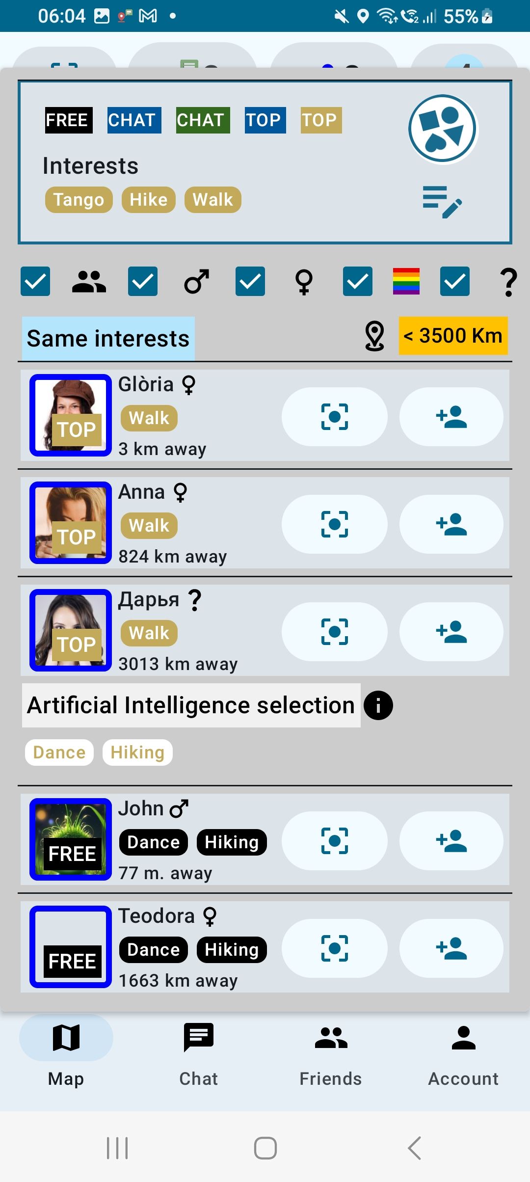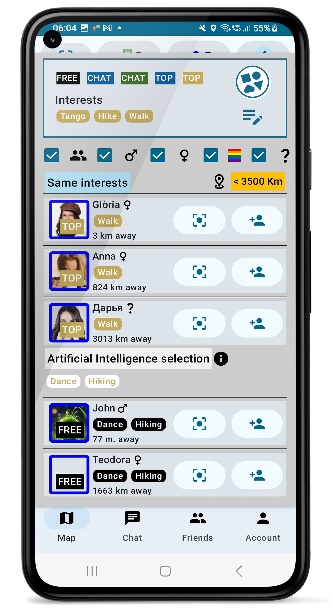 The Map screen of the App let you see users around. An AI driven dashboard shows you all the time users with matching interests close to your current location. After sending a connection request users can start chatting and meet in person on the spot..