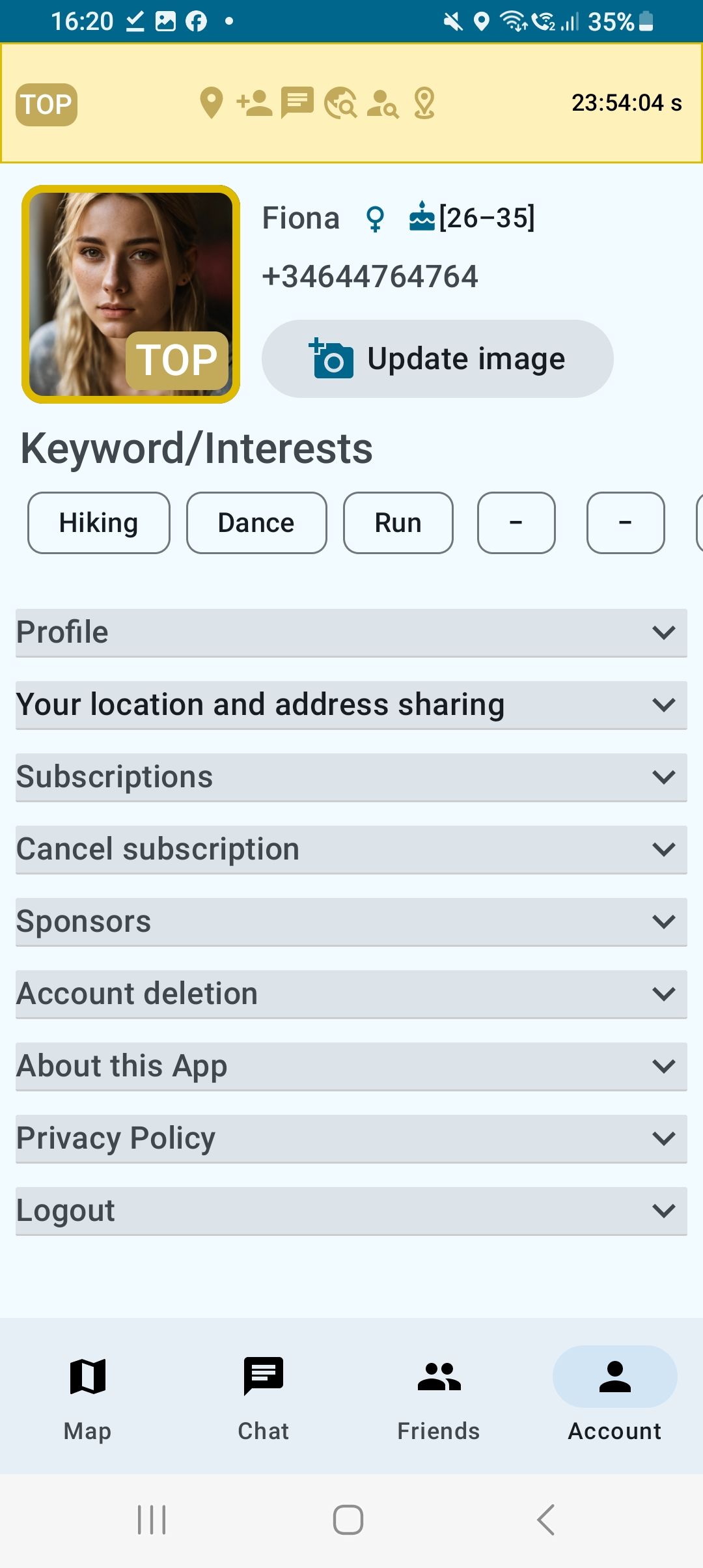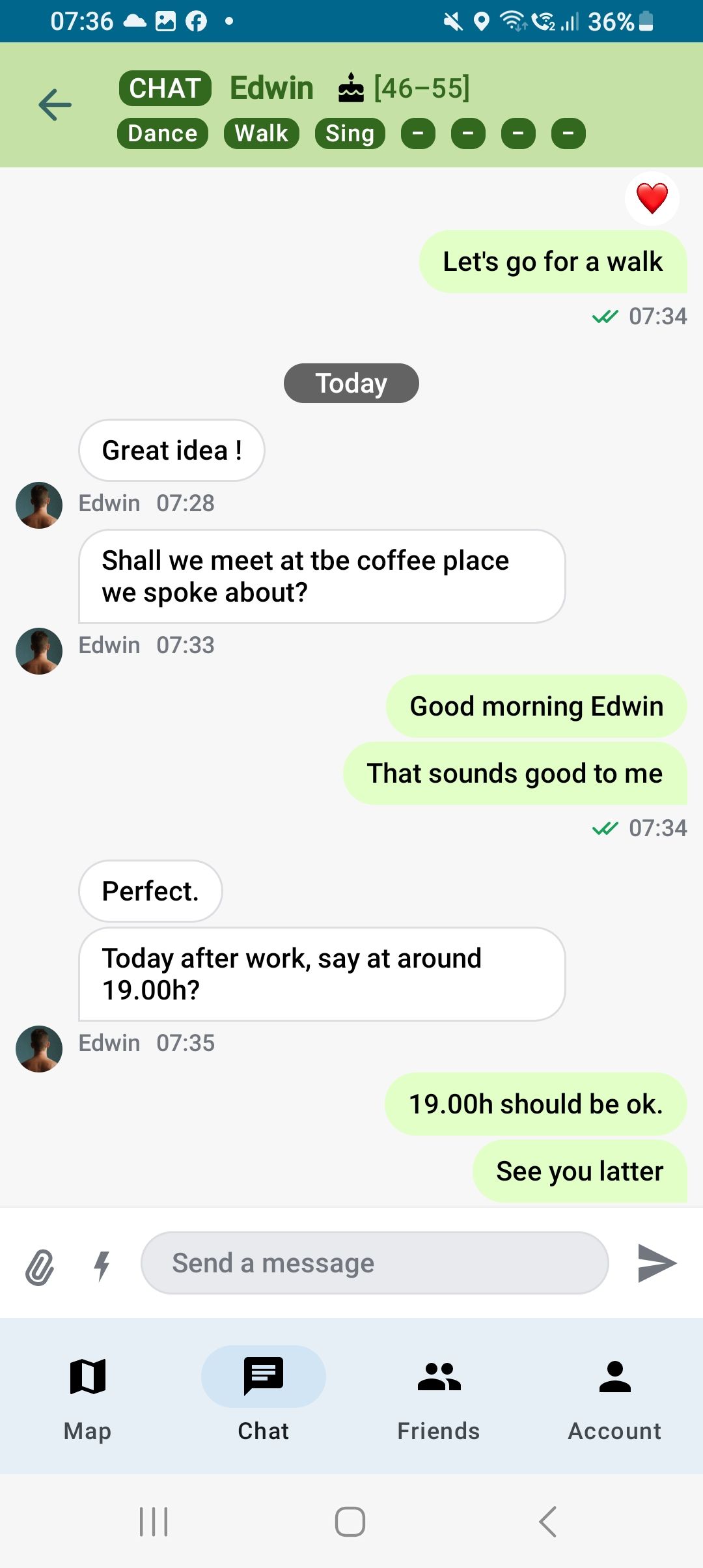 Chat is accessible directly from the user marker on the map, also from the chat room ( a list of chats like in WhatsApp) and also directly from the friends list, where we can also check their profile.